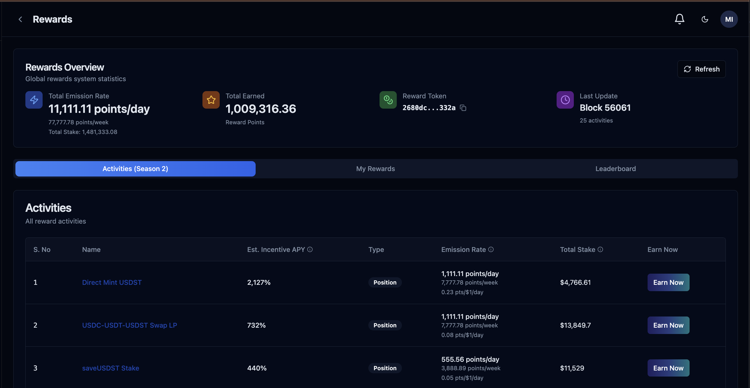 Activities like Direct Mint USDST and the USDC-USDT-USDST Swap LP each emit 1,111.11 points per day, while saveUSDST Stake and GOLDST-USDST Swap LP each emit 555.56 points per day. Estimated Incentive APY varies by pool and total stake — early participants benefit from higher rates.